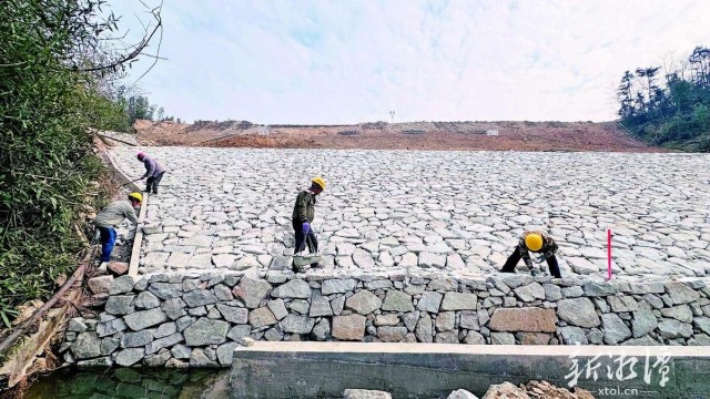 修库固坝在韶山杨林乡的舒塘水库大坝护坡工地,工人正在垒砌麻石巩固坝体。(李新辉 摄)
