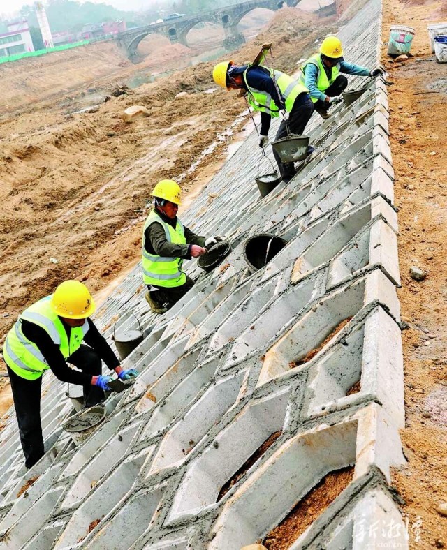 严丝合缝工人在用混凝土砌河堤护坡,加固堤岸。(方阳 摄)