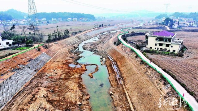 疏浚河道在湘乡市潭市镇与月山镇交界段的石狮江东干渠畔,蜿蜒14.4公里长的河段作业面全面铺开。(李新辉 摄)