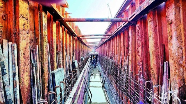 建站排涝在湘江大堤岳塘区下摄司村段的霞城片区排涝能力提升工程项目现场,多个作业面同时展开。(方阳 摄)