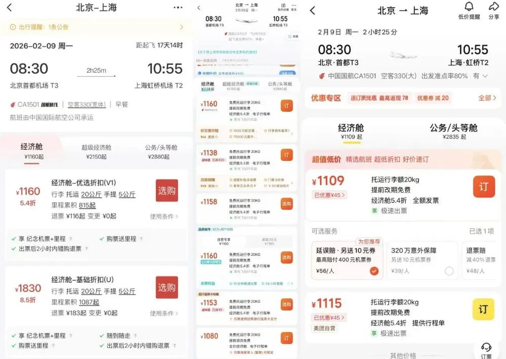 以2026年2月北京首都机场飞往上海虹桥的同一航班为例,航司APP上显示最优价格为1160元(未含机建燃油),在OTA平台上,叠加优惠后最低可达到1080元。