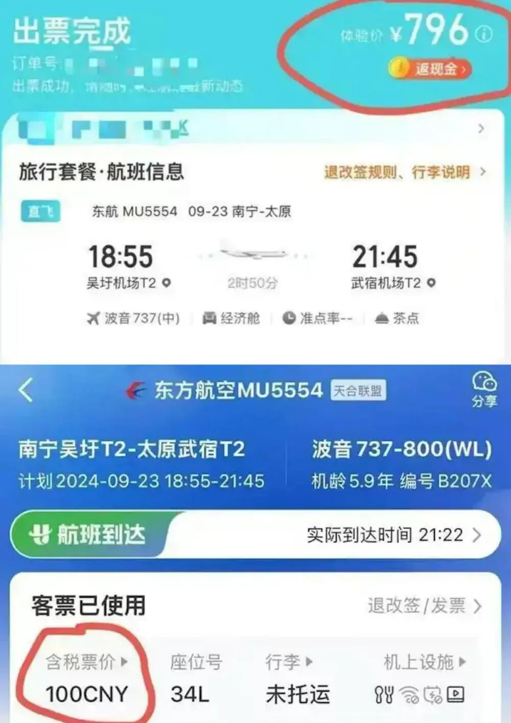 ▲(消费者订购机票支付页面,上面为某OTA平台价格,下面为航旅纵横显示票价)