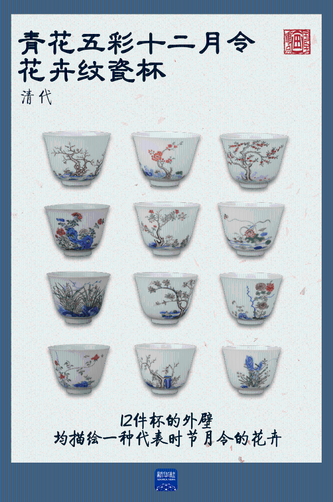 这套青花五彩十二月令花卉纹瓷杯藏于四川博物院,系景德镇官窑瓷器。12件杯组成一套,均为薄瓷胎,口微敞、深腹、圈足,每件杯的外壁描绘了一种代表时节月令的花卉。