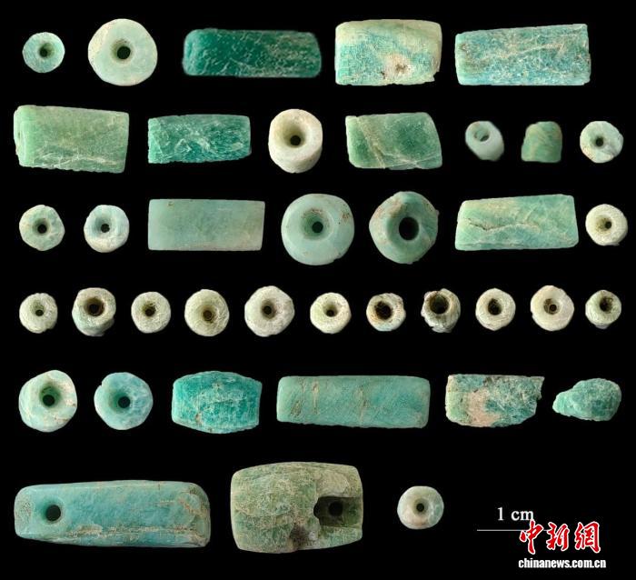 其中,从11座墓葬和1个灰坑中出土的39件天河石制品尤为引人注目。这些制品大多出土于墓主人的头骨和胸部附近,表明它们是作为个人装饰品使用。这些天河石制品包括珠、管、坠等多种形制,尺寸大多小于1厘米,颜色从浅绿到深绿不等。通过遗址出土的陶器、青铜器等伴出遗物的类型学分析,这批天河石制品的年代被确定在春秋晚期至西汉中晚期,距今约2500年-2000年。