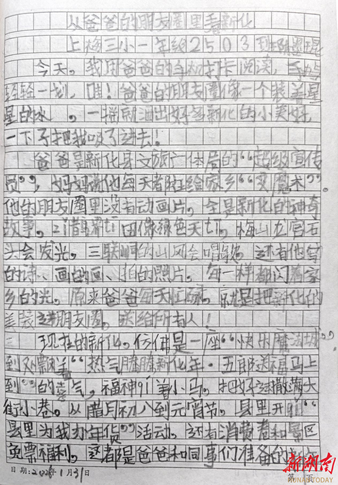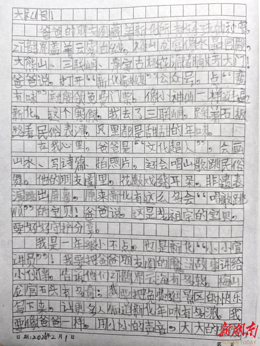 我是一年级小不点,也是新化“小小宣讲员”!我要把爸爸朋友圈的魔法故事讲给小伙伴,告诉他们紫鹊界云海有多软,梅山龙宫石头有多奇;我要把免费逛景区的快乐写下来,让更多人知道新化年味有多浓。我要像爸爸一样,用小小的声音,大大的热爱,为家乡加油!