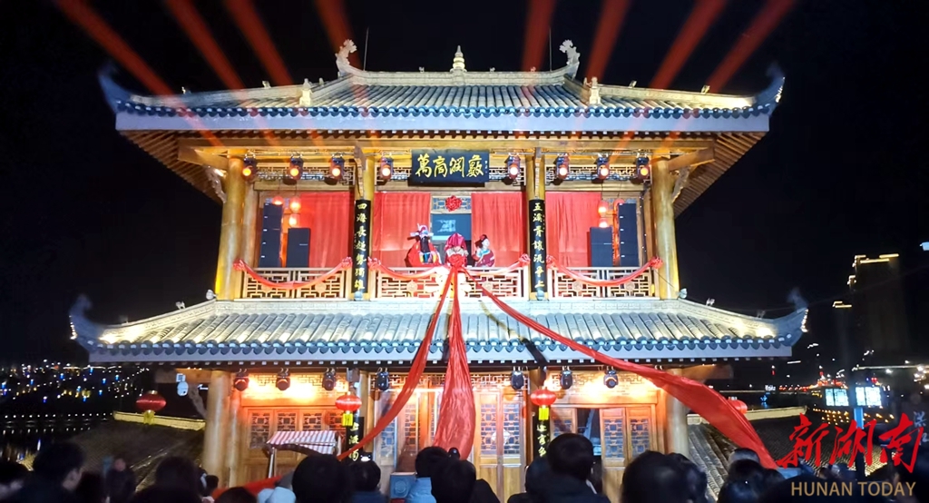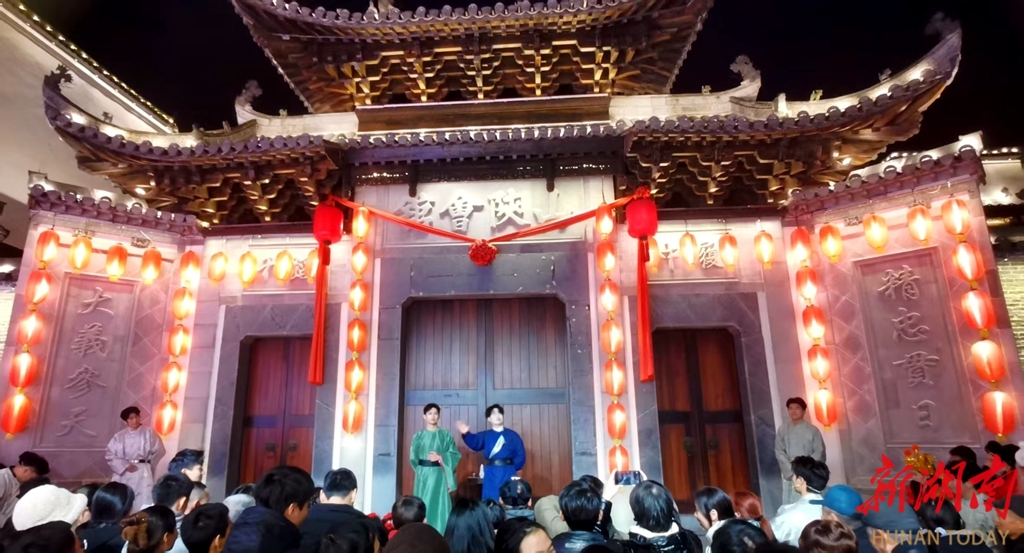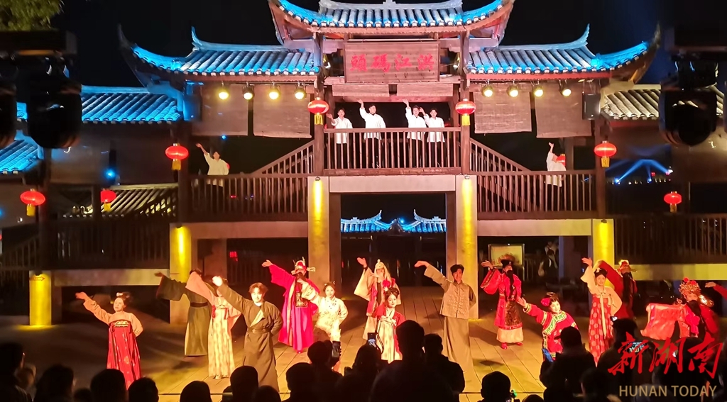 璀璨灯光秀次第亮起,还原了古市集“舟楫云集、商贾往来”的喧嚣盛况;望江楼前绣球招亲热闹非凡,游客争相接绣球,沉浸式体验传统招亲;山陕会馆前,斗诗斗舞轮番上演,衣袂翩跹间重现文人雅集的风流韵致;行至洪江码头,归乡团圆的温情剧情在沅水晚风里落幕,让人心生暖意。流动的演出让游客仿佛穿越回明清时期的繁华商埠,感受洪江古商城的烟火气与文化底蕴。