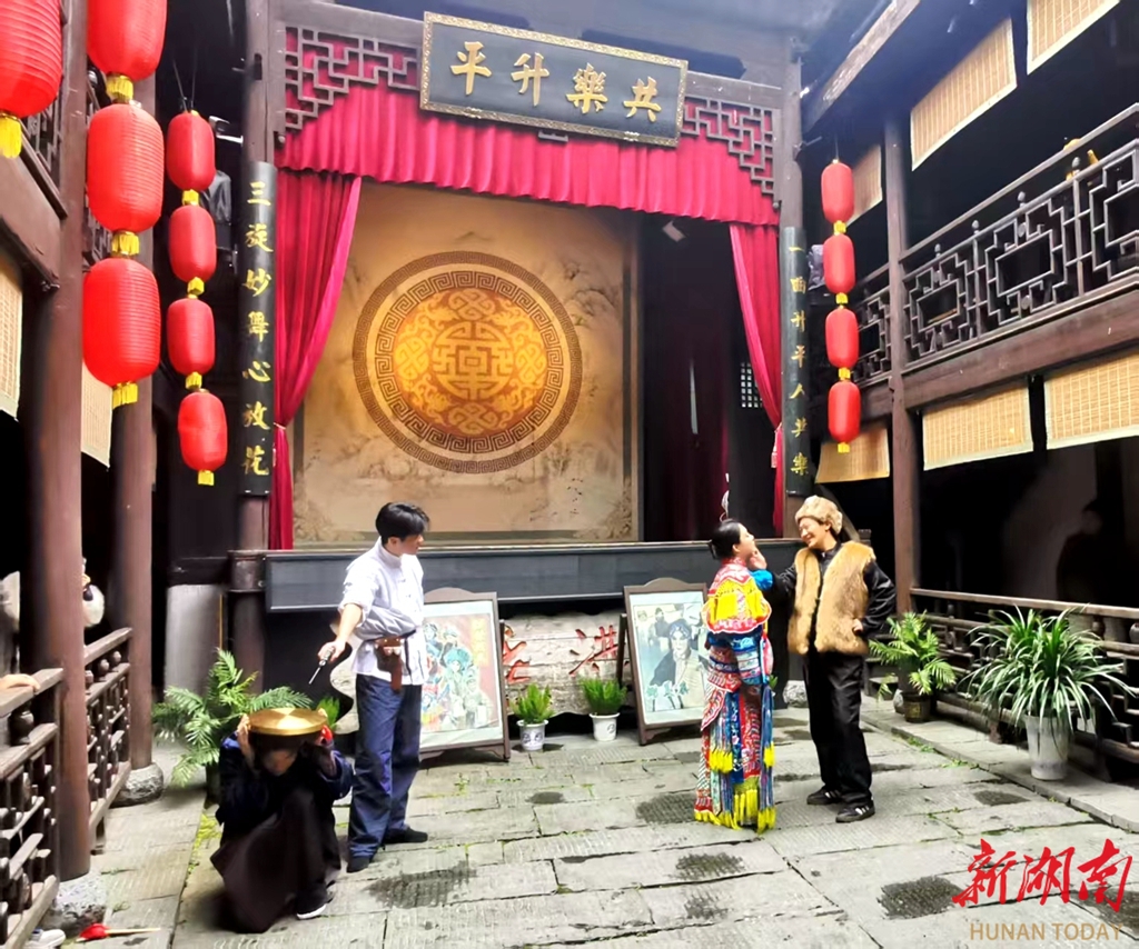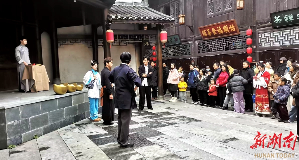 当天下午,天钧戏院、忠义镖局、聚宝广场、荷风苑等景点依次开演。游客化身实景剧中的角色,深度参与剧情的“主角”,感受全新的文旅体验。《戏韵洪江》演出现场,游客与镖师并肩而立,合力制服土匪,沉浸式感受镖师的忠义果敢;在《镖局谜云》中,大家化身侦探搜寻线索破解商道疑云,在推理中读懂诚信为本的商道准则;而《洪江喜相逢》的演绎,则让游客通过客串亲友,体验洪江传统婚俗的热闹与温情;实景剧《烟花柳巷》里,众人与文人雅士对句互动,一句句诗词唱和,尽览江南商埠的文人风雅。精心设计的互动环节,让千年洪商文化的忠义、诚信、重义精神变得可触可感。