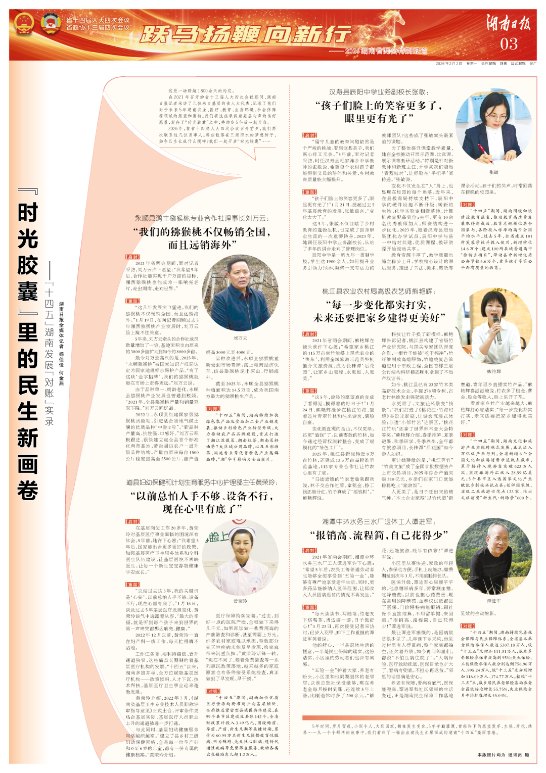 在2021年召开的省十三届人大四次会议期间,湖南日报记者采访了几位来自基层的省人大代表,记录了他们对于未来5年湖南农业、医疗、教育、生态环境、社会保障等领域的愿望和期待。我们将这些承载着基层心声的美好愿景,封存于“时光胶囊”之中,并约定5年后一起开启。