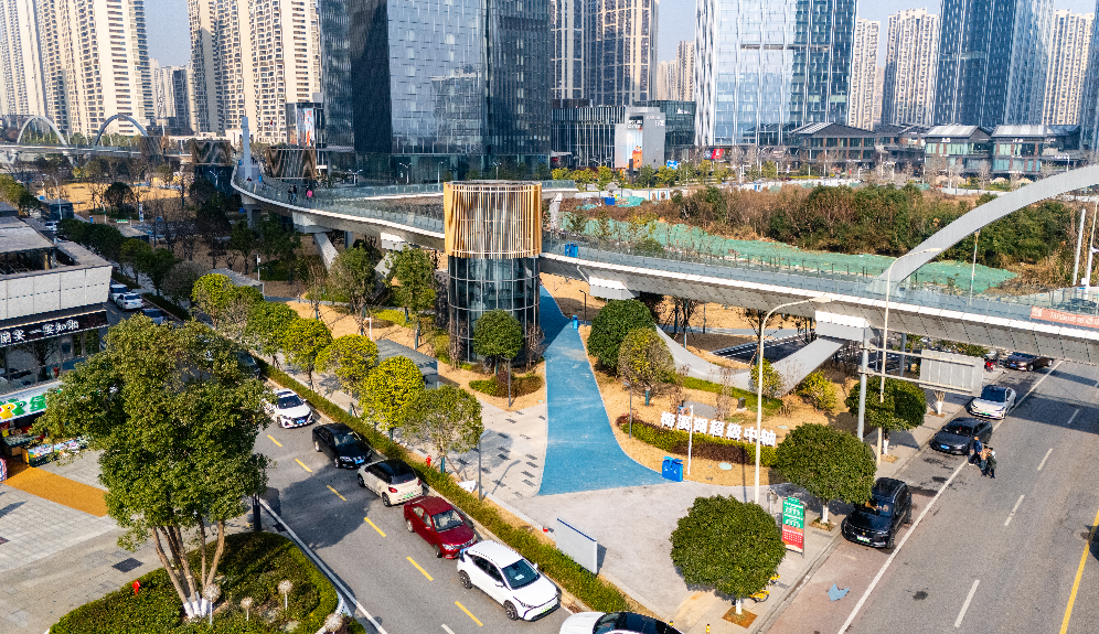 此次开放的核心亮点是“岛桥联通”格局全面成型。东段空中廊桥全长约450米、路面宽4.5米,跨越环湖路、五洲路和梅溪湖路,采用地面景观、人行廊桥与地下空间一体化设计。开放后,市民可从城市岛双螺旋观景平台出发,经空中廊桥衔接慢行系统,实现与沿线商业、住宅及公共空间的无缝穿行,彻底打通慢行交通“断点”,大幅提升出行与休闲便利性。