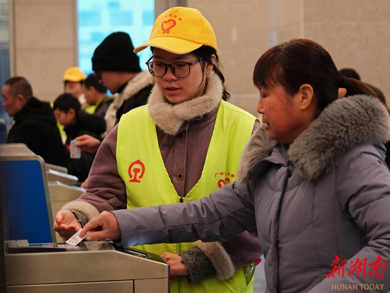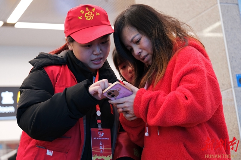 2月2日,长沙火车站,青年志愿者为旅客提供指引、咨询等服务。当天,2026年春运启动,至3月13日结束,为期40天。林道辉 摄(湖南图片库)