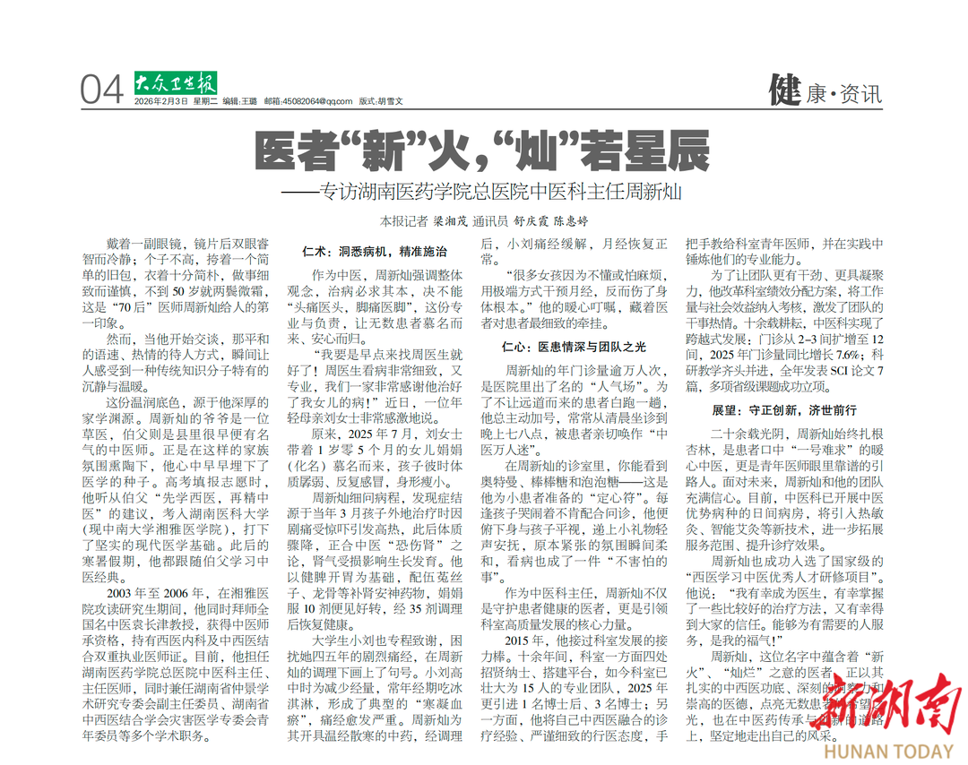从家学启蒙的少年,到独当一面的中医师,再到领航科室发展的科主任,二十余载光阴,周新灿始终扎根杏林、初心如磐,是患者口中“一号难求”的暖心中医,更是青年医师眼里靠谱的引路人。这份认可,藏在患者康复后的笑容里,映在年轻医生成长的足迹中,也刻在他对中医药传承与创新的执着追求里。