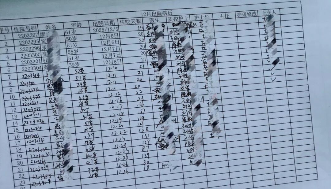 在一份出院记录表上,仅在2025年12月份,就有二十多位病人办理了出院手续,然而记者核实后发现,除了个别病人是真出院外,其余病人实际都还在医院里。该科室的一名护士向记者证实,确实有一部分病人办理了出院手续,实际仍在医院,所谓出院只是“假出院”。