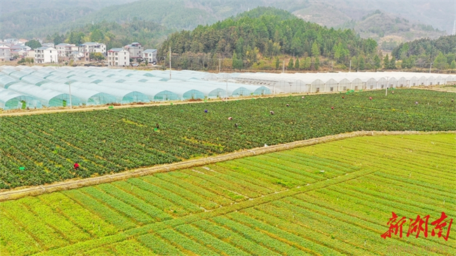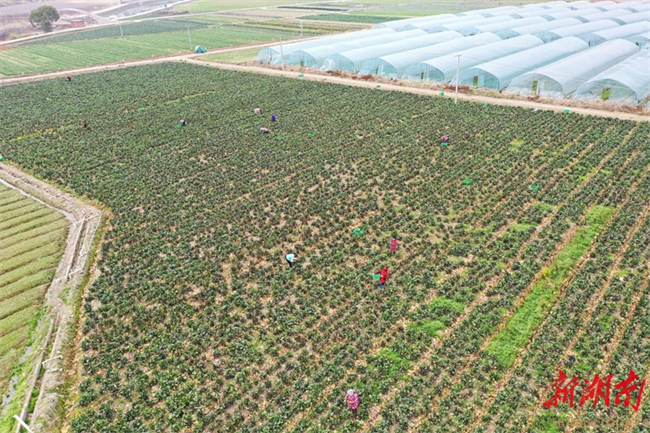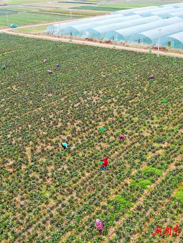 The photo, taken on February 1, shows farmers harvesting flowering cabbages at a selenium-rich vegetable plantation in Dongsheng Village, Xintian County. These flowering cabbages will be supplied to the Guangdong-Hong Kong-Macao Greater Bay Area. In recent years, the county has leveraged its selenium-rich resources and geographical advantages, setting up 18 dedicated vegetable supply bases and launching direct transportation service for the Greater Bay Area. This ensures that fresh vegetables can reach the market directly and efficiently.
