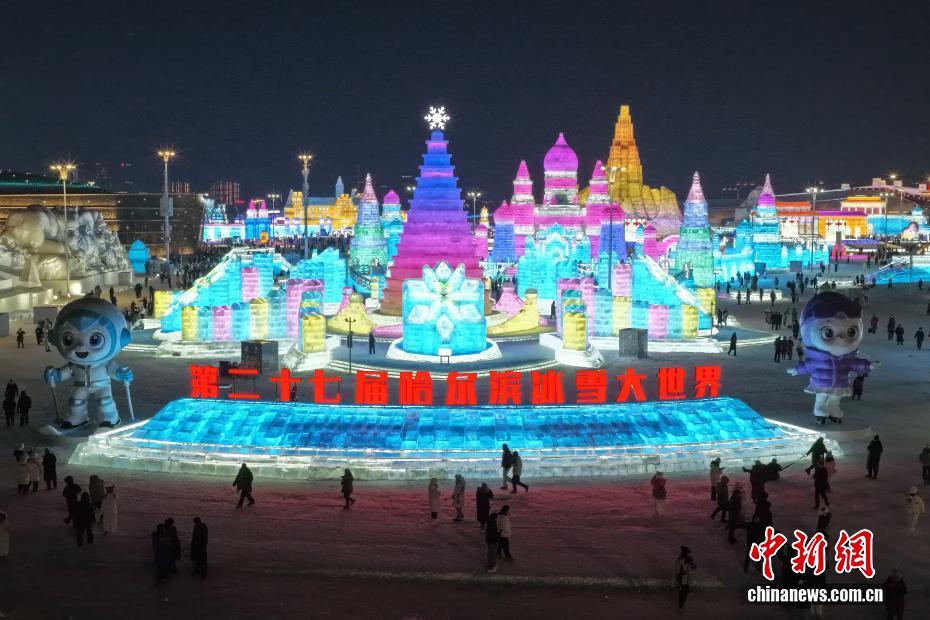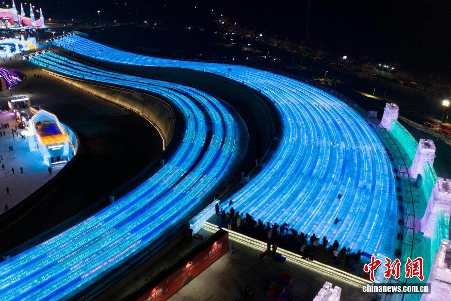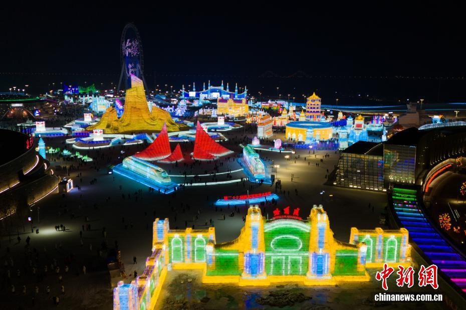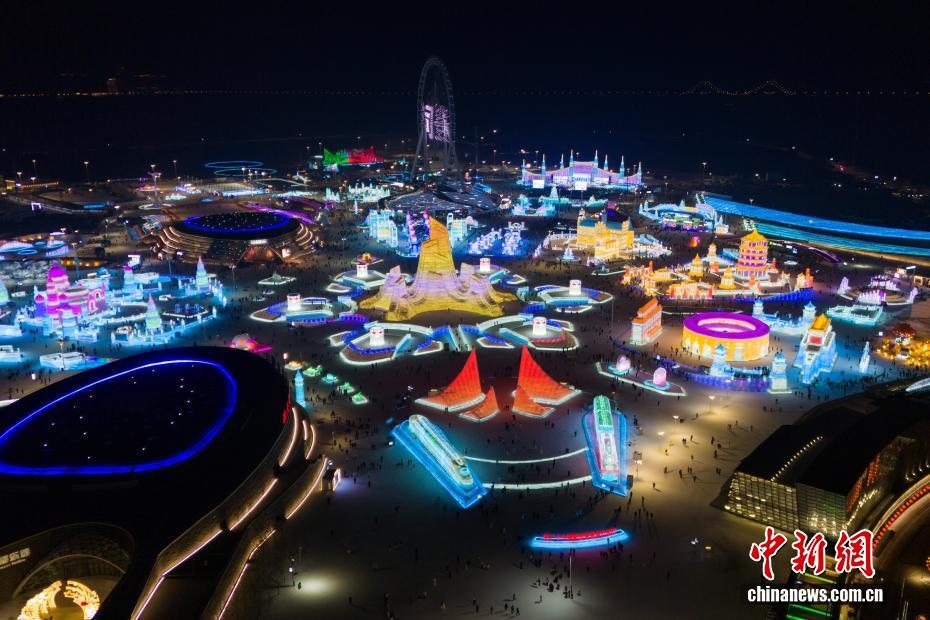近日,第二十七届哈尔滨冰雪大世界开园,本届冰雪大世界以“冰天雪地童话世界”为主题,园区整体面积扩大到120万平方米,用冰用雪量达40万立方米。随着夜幕降临,冰雕景观一一亮起,整个园区仿佛一座流光溢彩的童话王国。图为冰雪大世界夜景。(无人机照片)于琨 摄