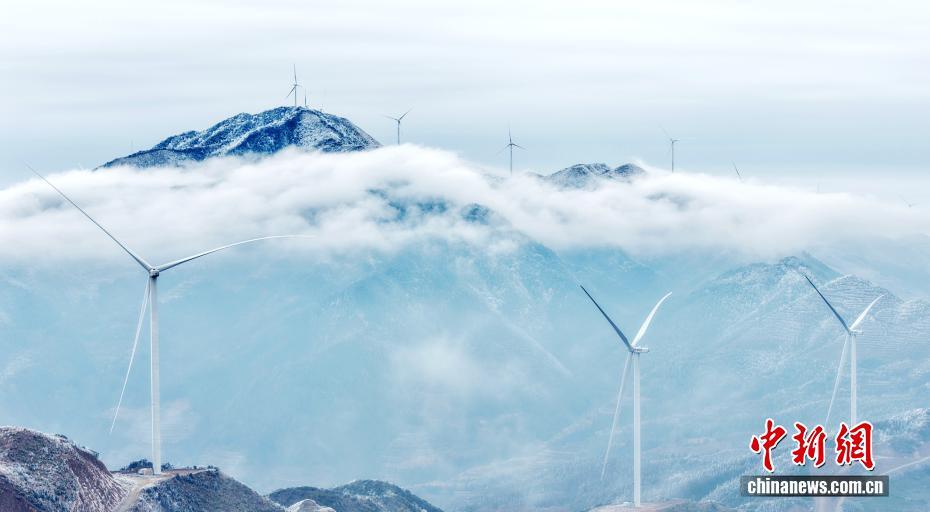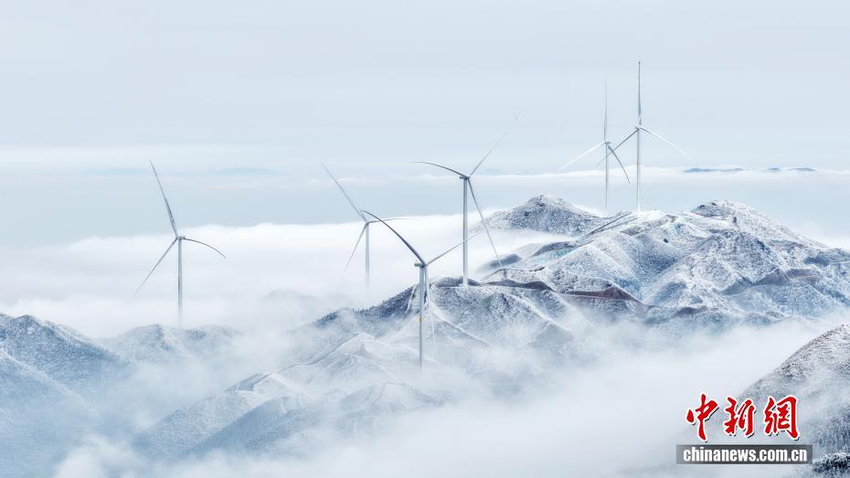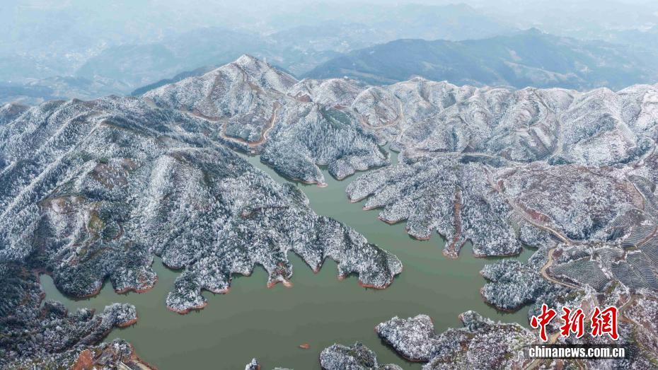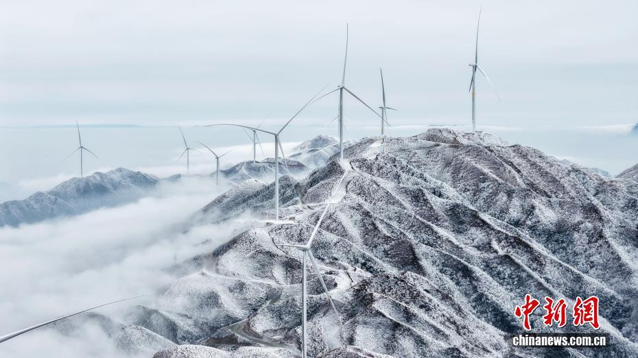 近日,雪后初霁,广西三江侗族自治县独峒镇大塘坳水库美如仙境。无人机凌空俯瞰,云涛奔涌,雪覆千峰,茶园碧色半掩玉沙,水库澄明如嵌琉璃,巨型风车于冰雾间若隐若现,冰雪、云海、碧水、茶园交织成一幅壮丽灵动的诗意画卷,宛如天上宫阙落人间。图为当地雪景美如画。龚普康 摄