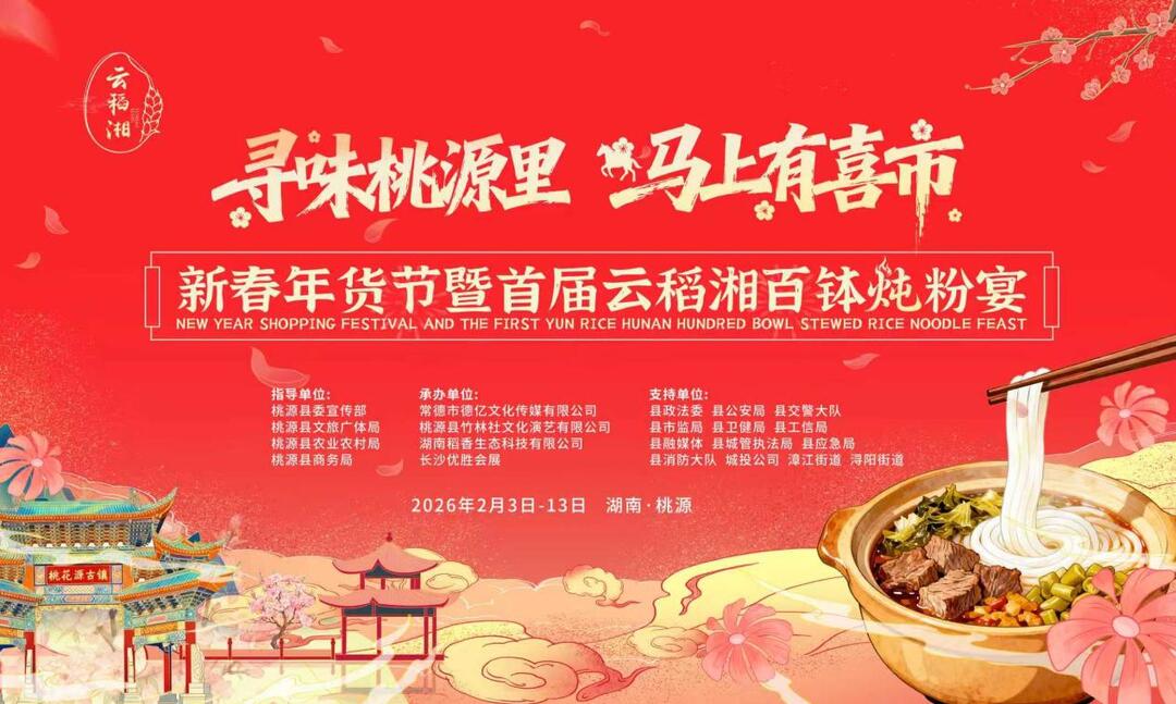 2月3日上午,桃源县采菱广场人声鼎沸,香气四溢,“寻味桃源里 马上有喜市”新春年货节暨首届云稻湘百钵炖粉宴在这里正式拉开帷幕。活动以百锅同炖免费吃的壮观场景、地道鲜香的桃源炖粉、丰富实惠的年货市集,为当地百姓奉献了一场集美食、文化、消费于一体的新春盛宴,吸引了众多市民前来品味年味、置办年货。