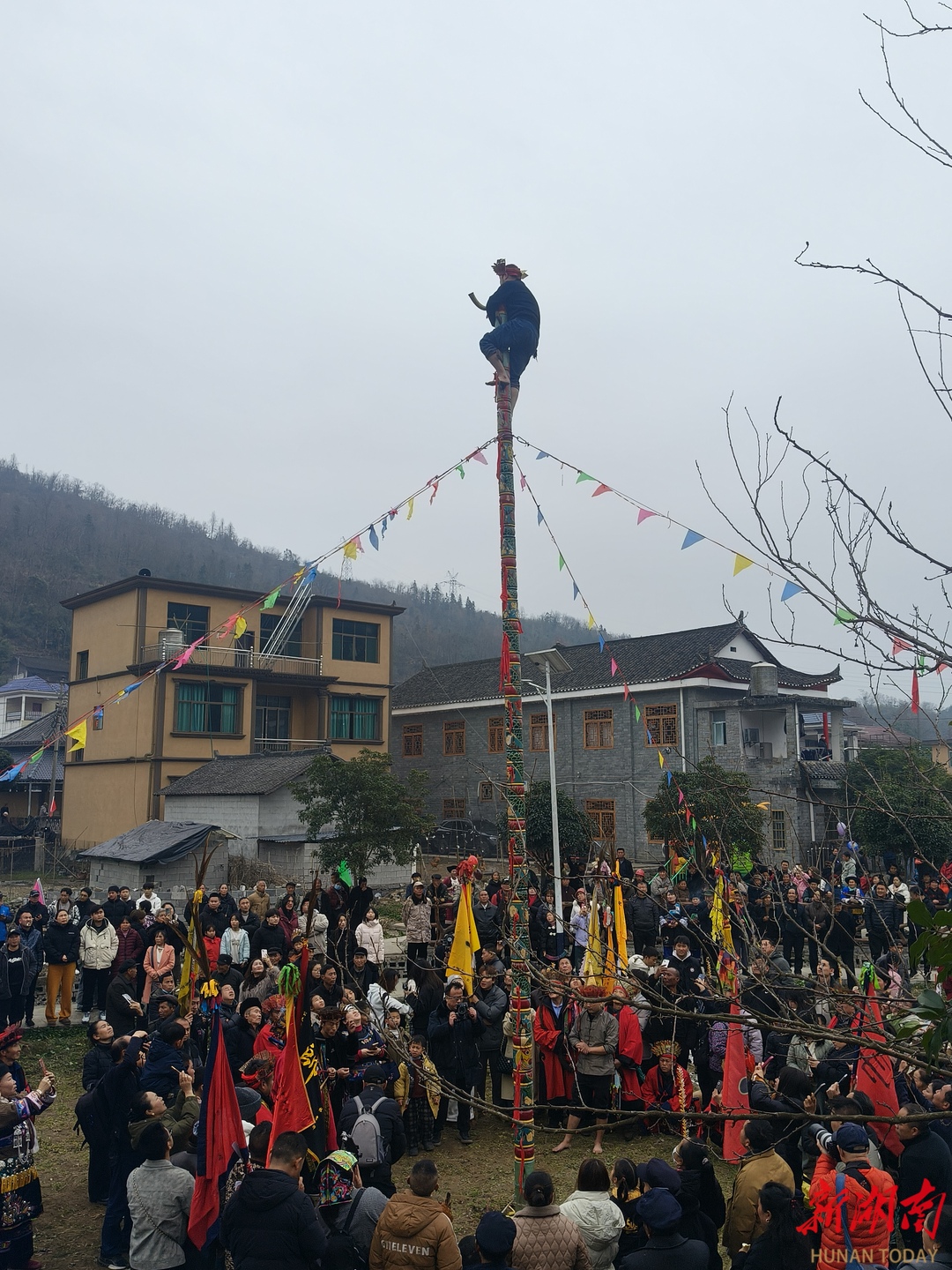 田野间,“上刀梯”表演开始了。赤脚汉子踩着36把寒光凛凛的钢刀攀至杆顶。“太刺激了,第一次近距离看到这样的刀梯表演。”一名株洲游客说。