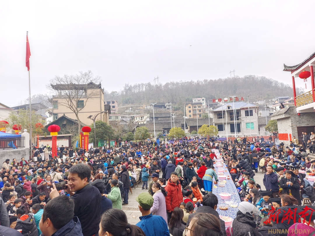 坪场上,杀年猪的热闹还在继续,新鲜的猪肉滋滋冒香;广场边,12口大锅依次排开,苗鱼、豆腐等苗家地道菜摆上200米长桌。