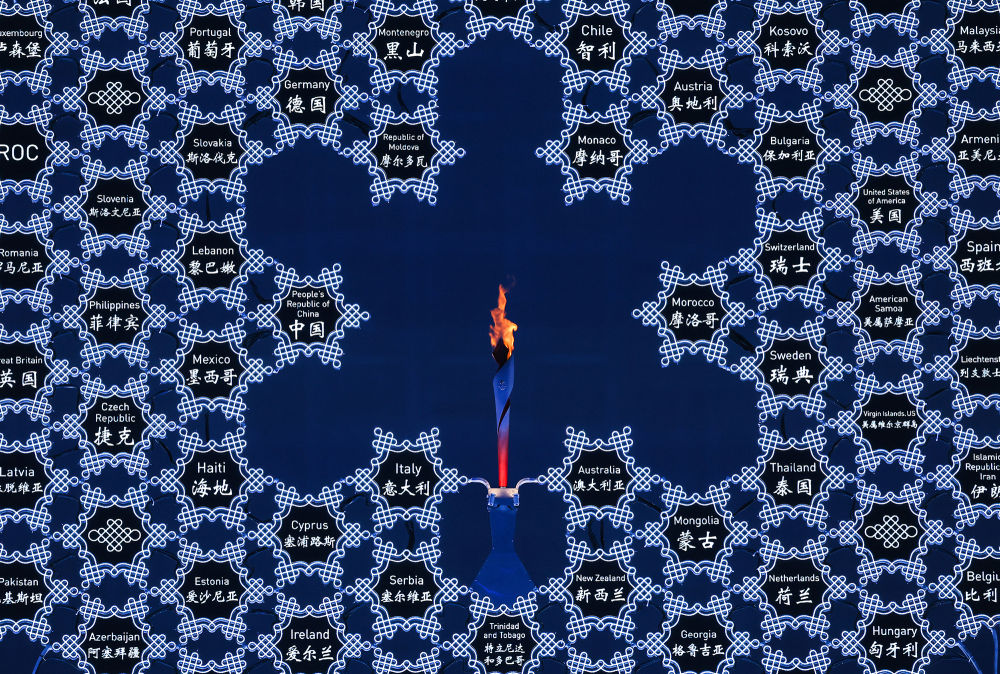 小雪花牌相拥成巨型雪花环绕主火炬台绽放诠释“世界大同,天下一家”的内涵