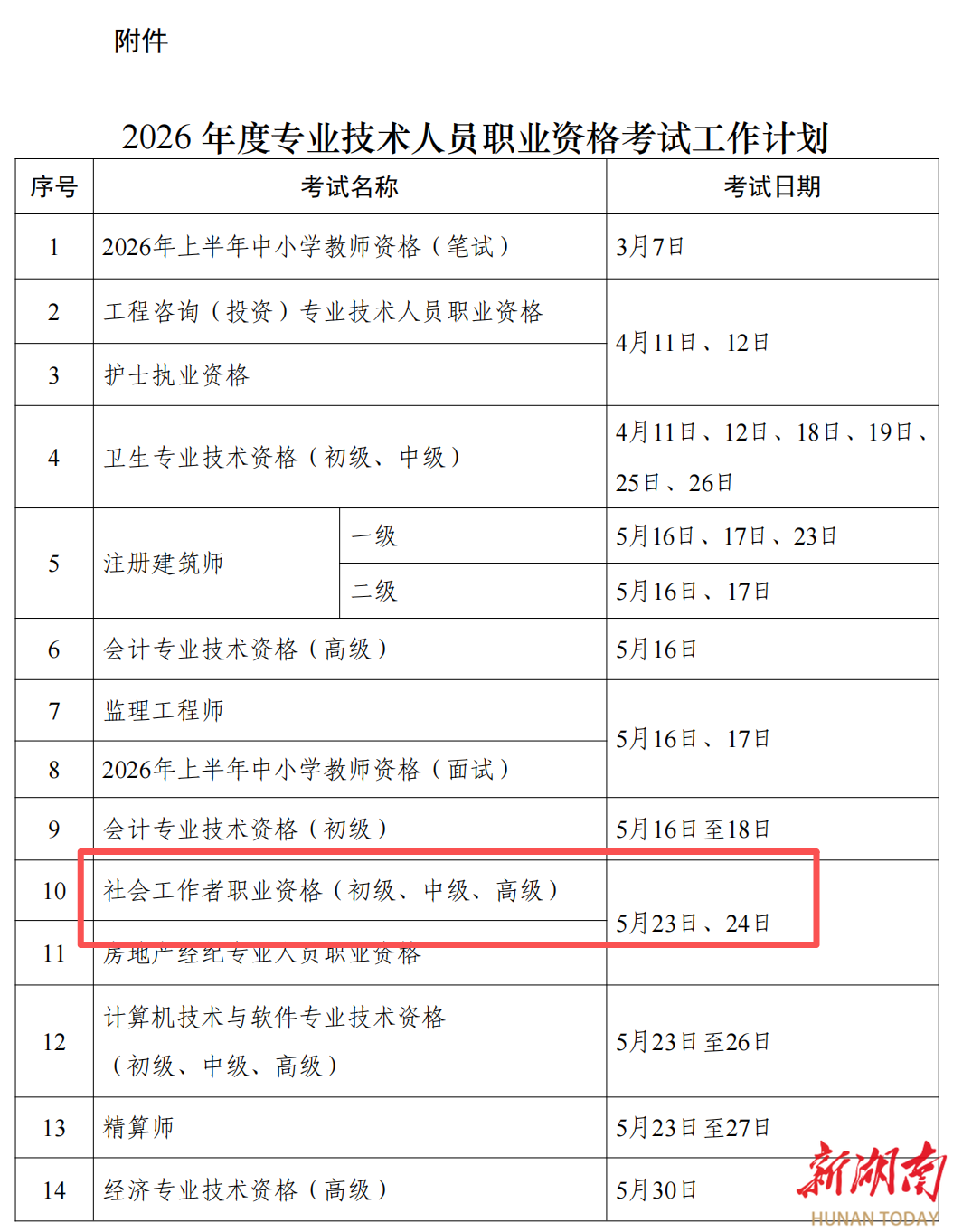 湖南日报·新湖南客户端2月4日讯(全媒体记者 王振亚 通讯员 夏晨瑶)今天,记者从省委社会工作部获悉,2026年社会工作者职业资格考试(初级、中级、高级)定于5月23日至24日举行。