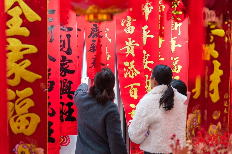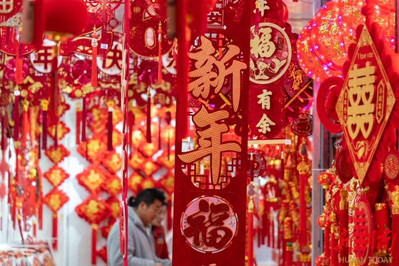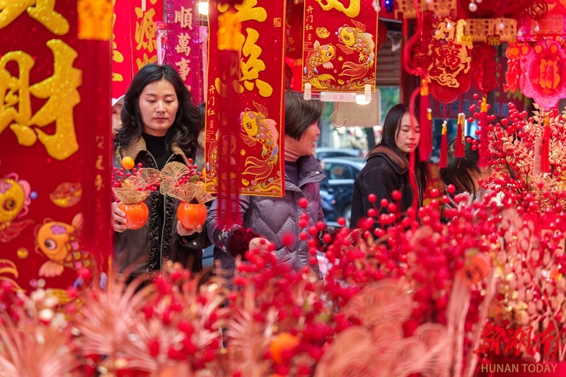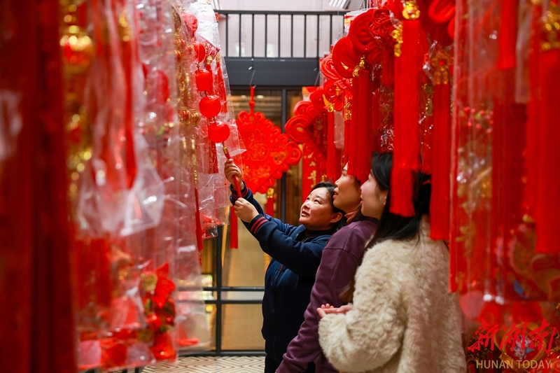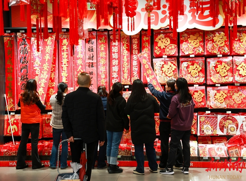 2月4日,市民在常德市超市选购新年饰品。春节临近,当地商场和年货市场上“福”字、春联、灯笼、马年挂件等各式新年饰品琳琅满目,呈现出一派红火喜庆的节日氛围,吸引众多市民前来采购。蔡文龙 摄(湖南图片库)