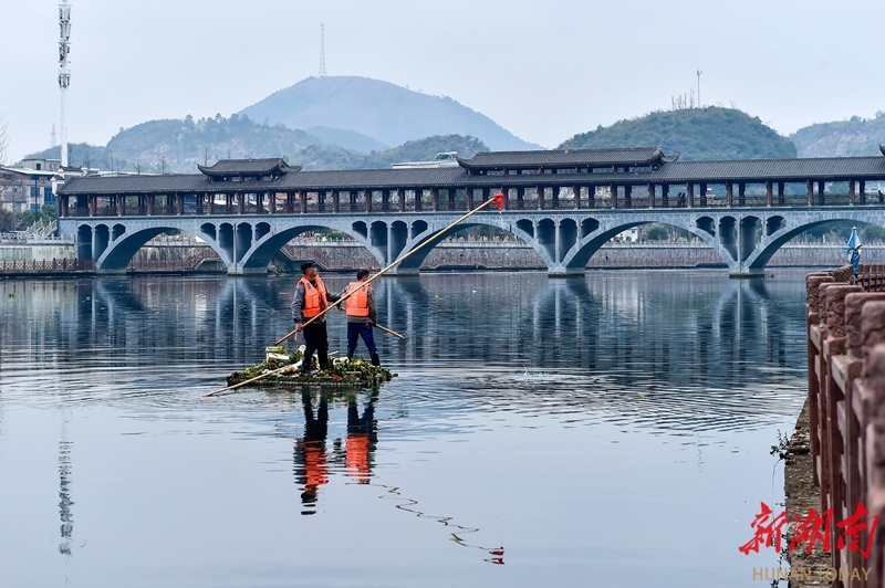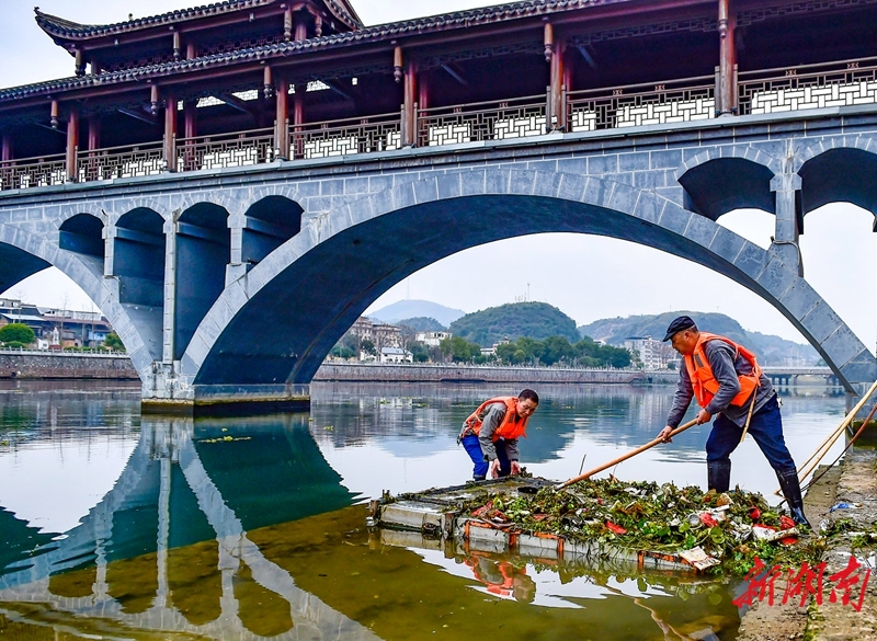 2月4日,潇水江永县县城段,保洁员在清理水浮莲、塑料垃圾等漂浮物。春节前夕,当地组织专项清理行动,着力打造河畅水清的节日环境。潘百旺 摄(湖南图片库)
