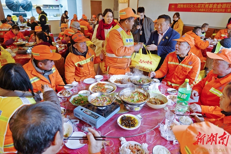 2月4日中午,长沙市雨花区高桥街道的80名环卫工人和外卖骑手欢聚一堂,品尝丰盛的团年宴。当天,“长沙好人”浏阳伢子张尚友连续第17年邀请一线环卫工人和外卖骑手吃免费团年宴并赠送新年大礼包,让这些城市的服务人员感受到温暖,感谢他们为城市保洁和派送所做的贡献。湖南日报全媒体记者 徐行 摄
