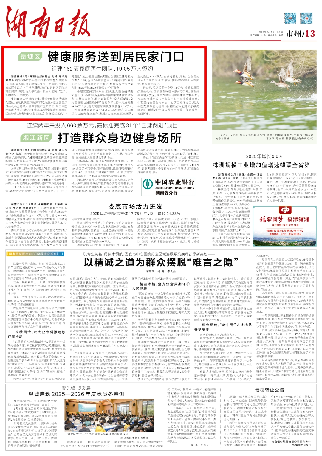 张湘理老人经历的变化,得益于岳塘区持续深化医改,推动优质医疗资源下沉。该区9家基层医疗卫生机构全部纳入湘潭市城市医疗集团,与三甲医院实现人才、技术、设备共享,62种常见病可在社区医院诊疗。患者转诊上级医院后,信息通过系统“一键直达”,免去重复检查的烦恼。岳塘区卫健局相关负责人介绍,全区“小病在基层、大病到医院、康复回社区”的就医格局逐步形成。岳塘区基层诊疗量占比,2025年比2020年增长17个百分点。
