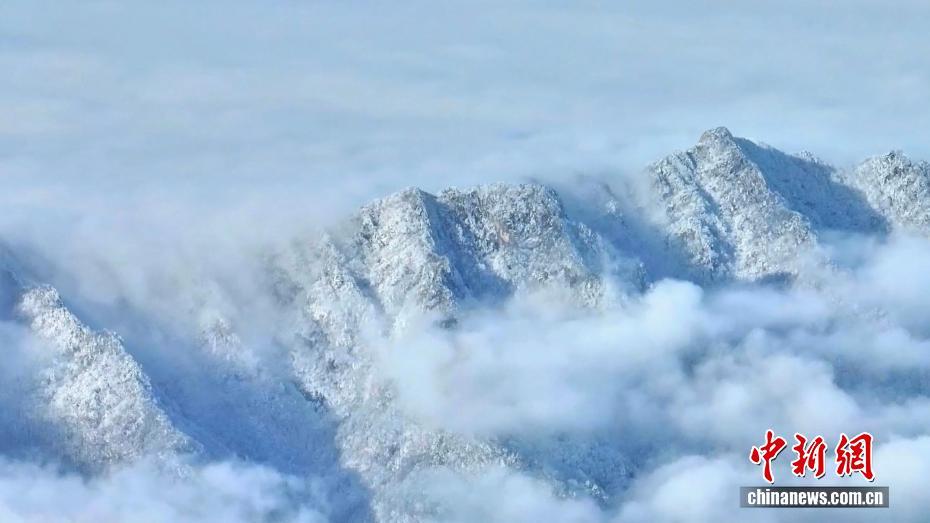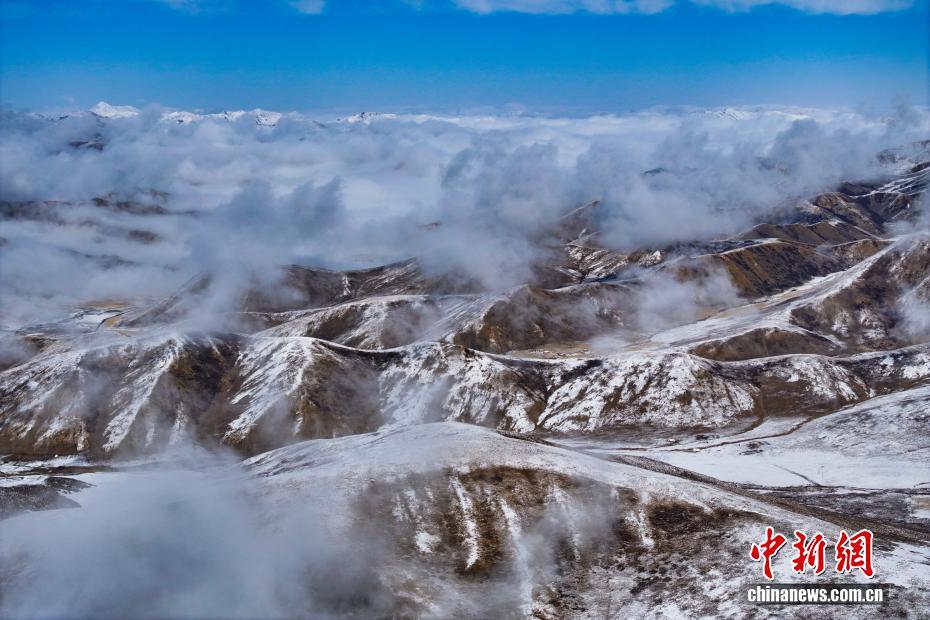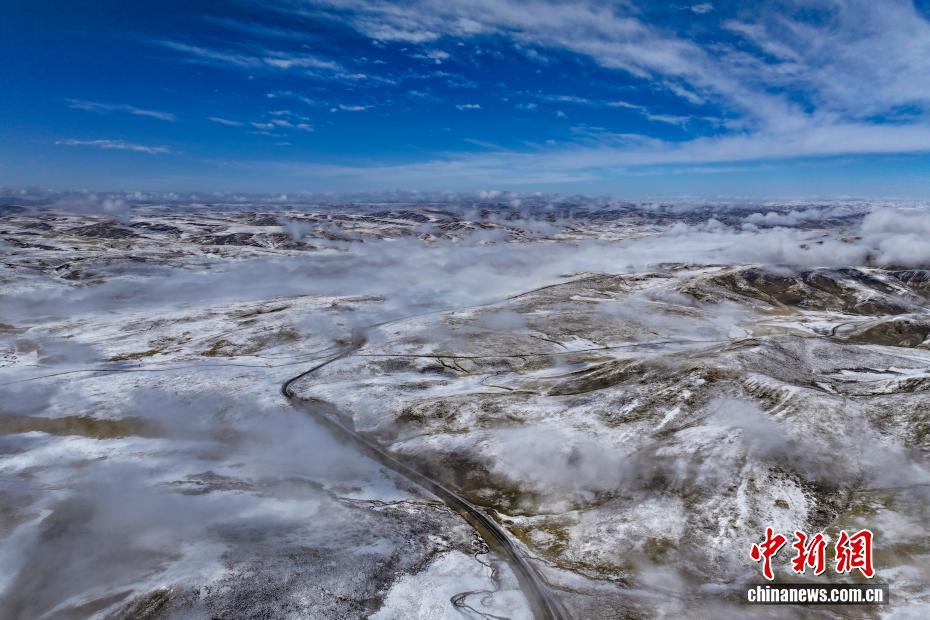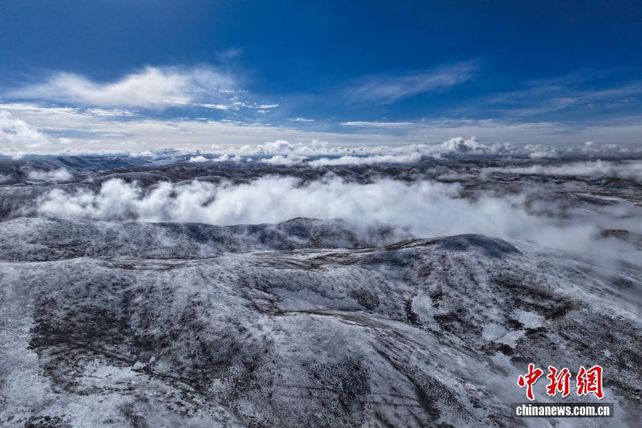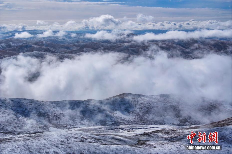 近日,一场降雪过后,平均海拔4200米以上的青海省果洛藏族自治州达日县出现云海景观,从空中俯瞰,落雪的山峦在云雾中若影若现,宛如壮阔水墨画卷。图为云海景观。(无人机照片)马铭言 摄