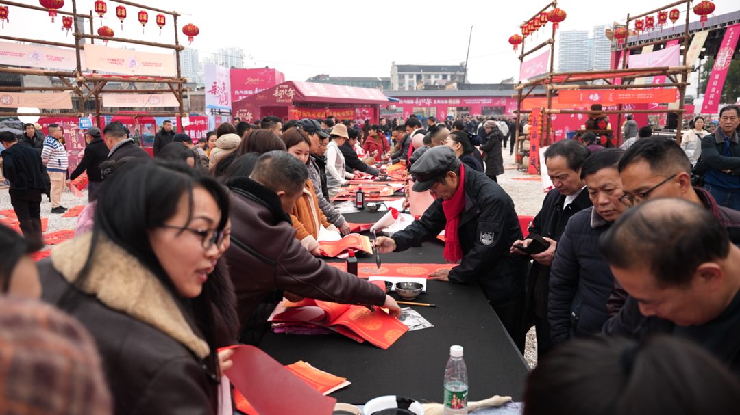 在互动环节,领导嘉宾与游客共同体验打糍粑、水磨豆腐、写春联等民俗项目。吊锅茶寿宴香气扑鼻,福禄寿喜财“五面鼓”开街巡游更是将传统年味推向了高潮。