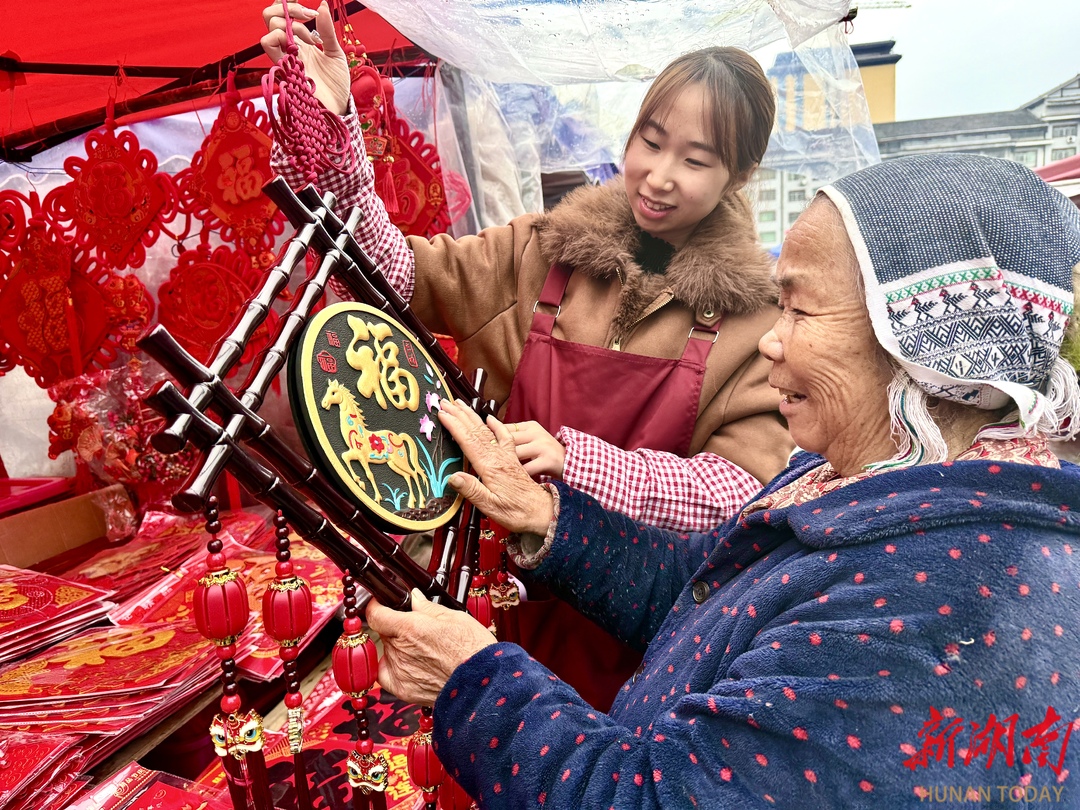 2月4日,通道侗族自治县城东年货集市,一位老年人在选购“马上有福”挂件。随着马年春节临近,该县精美的“马元素”饰品,成为民众把“年味”带回家的“香饽饽”。(陈俊宇 摄影报道)