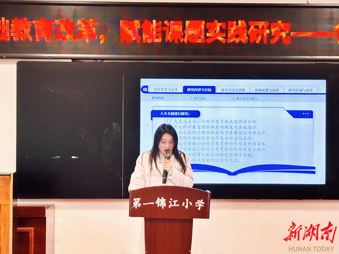 在课题汇报环节,四项课题负责人登台作开题报告。第一锦江小学王婷围绕《欠发达县域小学科学教育多元协同育人模式构建及实践研究》,代远学校莫蓉聚焦《教育强国背景下区域红色文化与校园思政教育融合的路径与措施研究》,兰村小学谭雯阐述《边艰地区“六位一体”培训模式对教师专业成长实效性的研究》,第二锦江小学段莘盈针对《新课标视野下县域小学语文整本书阅读教学面临的困境及对策》,分别从研究背景、核心内容、实施路径等方面进行详细汇报,展现了扎实的研究基础与清晰的研究思路。