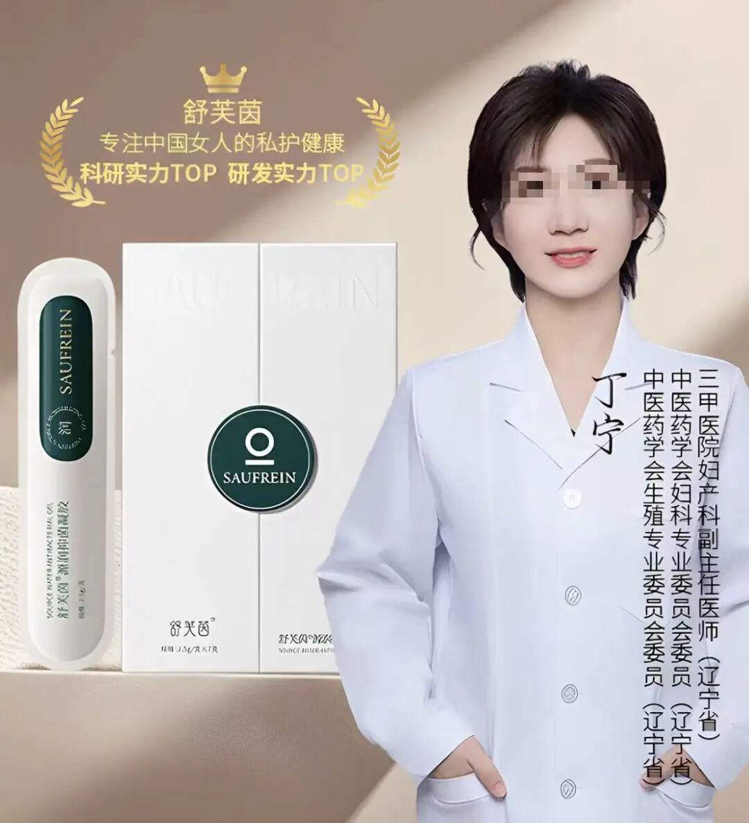 无独有偶,在舒芙茵源润抑菌凝胶的介绍中,也出现了一张身穿“白大褂”女性与该产品放在一起的图片,并在人物旁标注“三甲医院妇产科副主任医师(辽宁省)、中医药学会妇科专业委员会委员(辽宁省)、中医药学会生殖专业委员会委员(辽宁省)丁宁”。