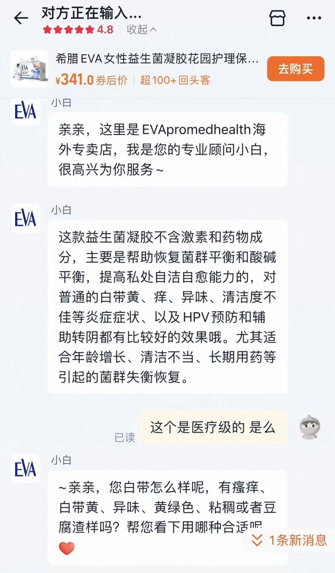 ▲EVApromedhealth海外专卖店客服介绍腊EVA女性益生菌凝胶对部分炎症症状及HPV预防和辅助转阴有效。