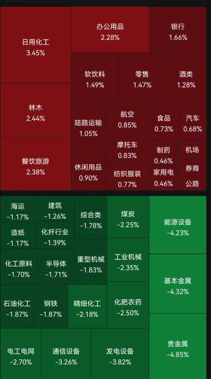 盘面上影视院线、旅游酒店等板块领涨,贵金属、光伏设备分别下跌6.57%、5.31%。