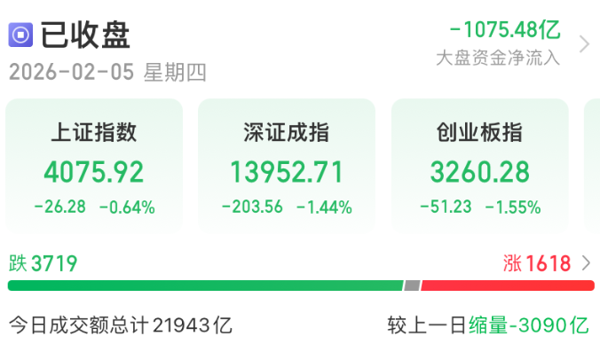 2月5日,A股三大指数集体下跌。截至收盘,沪指跌0.64%,深成指跌1.44%,创业板指跌1.55%,北证50指数跌2.03%,沪深京三市成交额21943亿元,较上日缩量3090亿元,三市超3700只个股下跌。