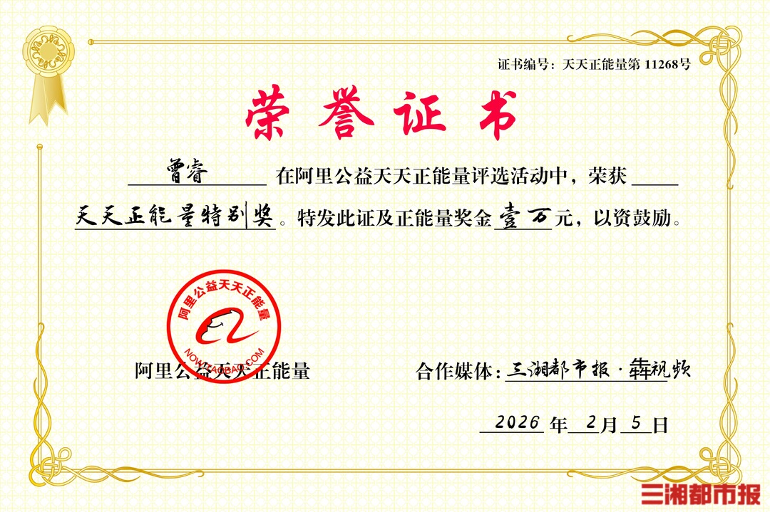 2月5日,三湘都市报·犇视频联合阿里公益天天正能量,为22岁小伙曾睿颁发正能量特别奖及10000元奖励,点赞他顶着严寒、不顾安危跳桥救人的勇敢之举。面对这份荣誉与奖励,曾睿坦言:“为自己感到有点小骄傲和自豪。”