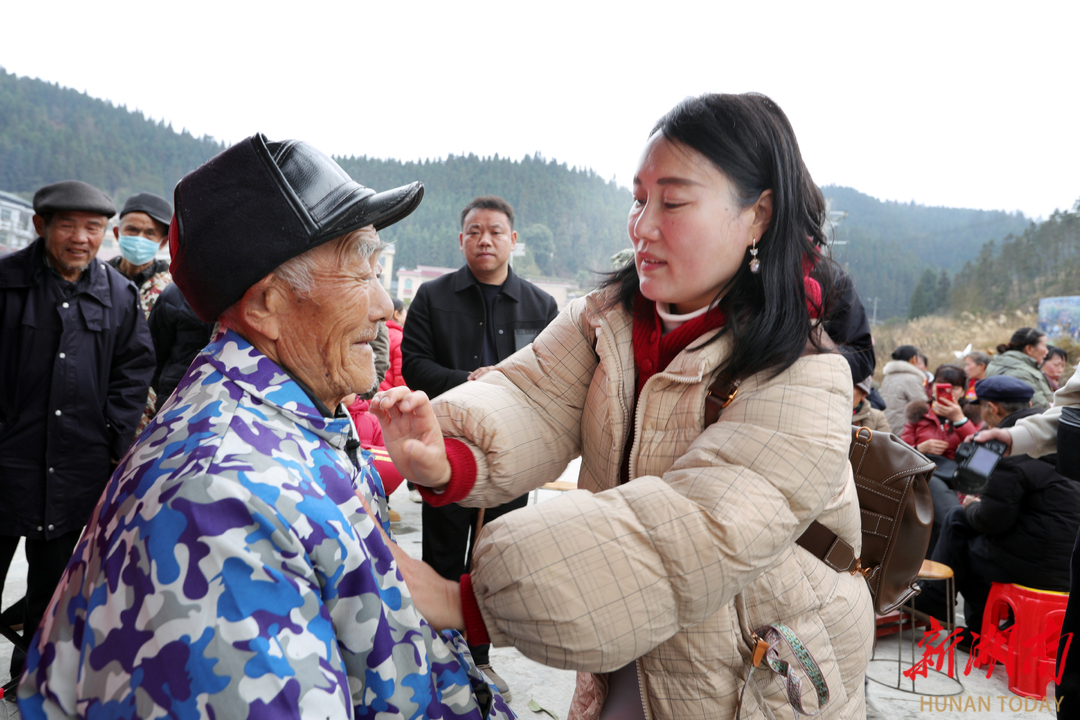 2月4日,摄影师在为老人家整理着装。2月3日至4日,湖南省摄影家协会在凤凰县水打田乡东子山村开展“强基工程”新春特别行动。青年摄影师为村民免费拍摄全家福,用影像记录团圆时刻,助力乡村文化振兴。 罗新国 摄(湖南图片库)