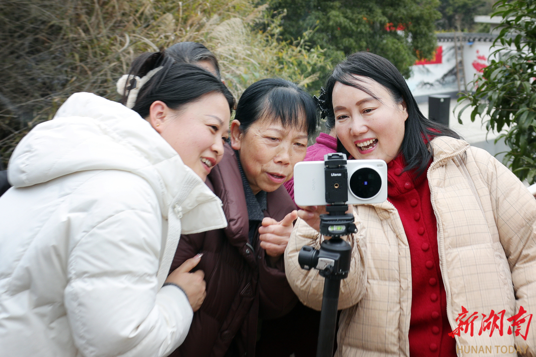 2月3日,村民在欣赏刚拍摄的全家福。2月3日至4日,湖南省摄影家协会在凤凰县水打田乡东子山村开展“强基工程”新春特别行动。青年摄影师为村民免费拍摄全家福,用影像记录团圆时刻,助力乡村文化振兴。 罗新国 摄(湖南图片库)