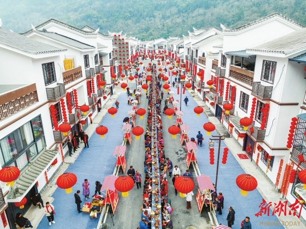 2月4日,湘西土家族苗族自治州吉首市大兴寨水库矮寨移民安置区,移民群众欢聚长桌宴。当天,该安置区开展迎新春活动,民俗展演、长桌宴、年味集市等精彩纷呈,移民群众在崭新家园里,热热闹闹喜迎新春。