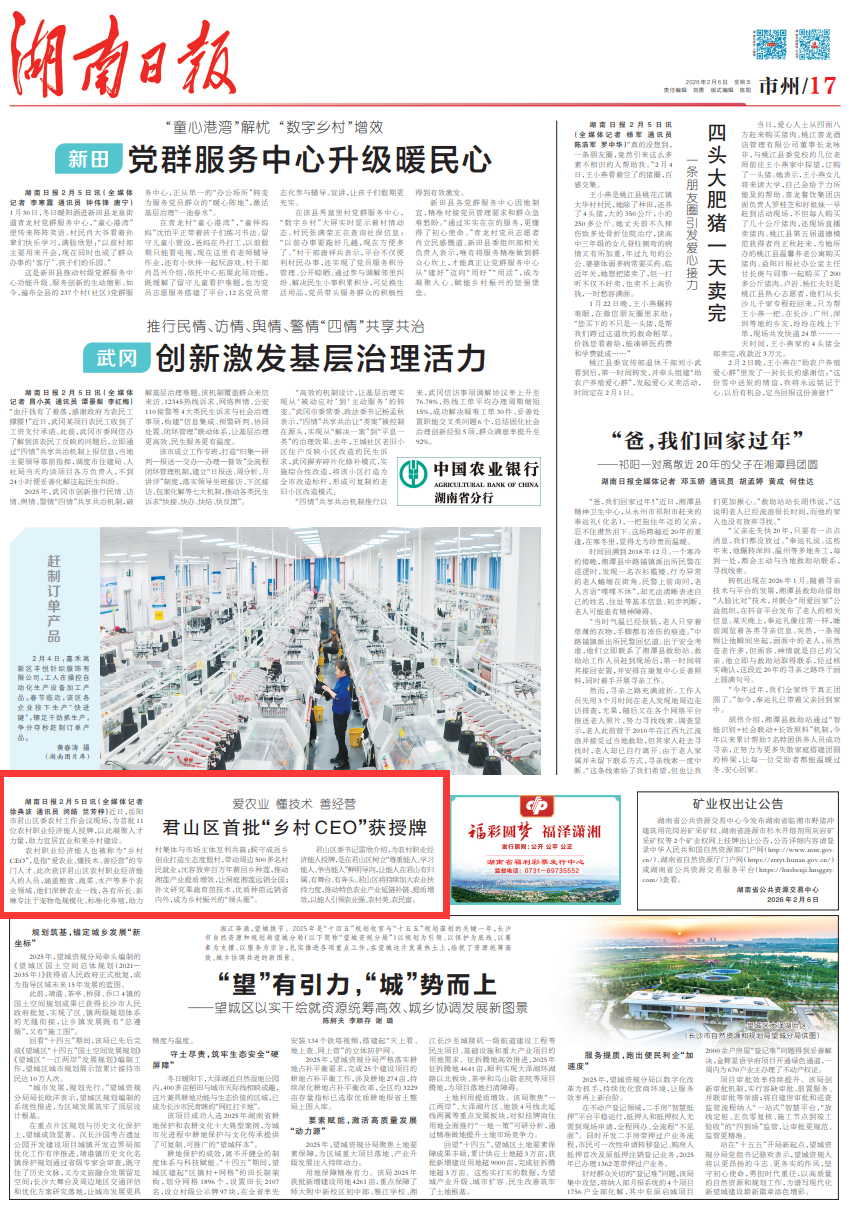 君山区委书记雷欣介绍,为农村职业经济能人授牌,是在君山区树立“尊重能人、学习能人、争当能人”鲜明导向,让能人在君山有归属、有舞台、有奔头。君山区将持续加大农业扶持力度,推动特色农业产业延链补链、提质增效,以能人引领农业强、农村美、农民富。