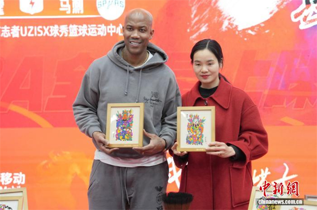 Stephon Marbury (L) shows the self-made new year painting. (Photo/Yang Huafeng, Chinanews)