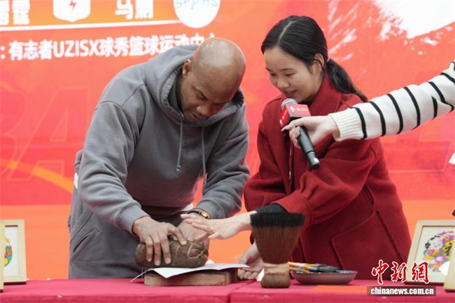 Stephon Marbury (L) tries his hand at Changsha woodblock new year painting. (Photo/Yang Huafeng, Chinanews)