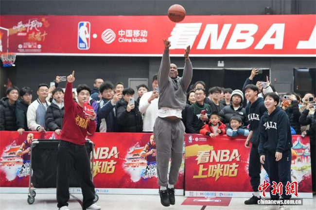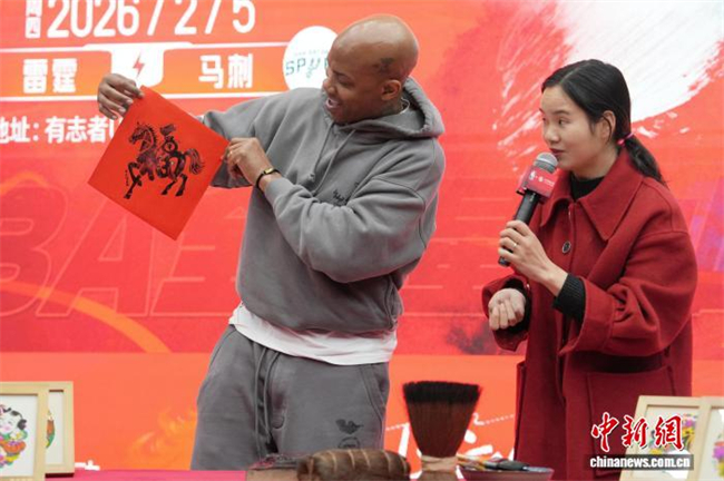 Former NBA star Stephon Marbury visited Changsha on February 5, 2026. He watched a basketball game with fans, learned Huagu or flower-drum opera, and experienced Changsha woodblock new year painting, immersing himself in the traditional Chinese New Year atmosphere and the charm of intangible cultural heritage. The photo shows Stephon Marbury (3rd L) watches an NBA game with fans. (Photo/Yang Huafeng, Chinanews)
