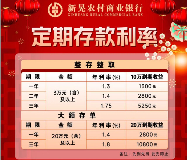 新晃农商行1月21日发布公告,推出3万元起存的专项存款,其中1年期利率定为1.30%,2年期1.40%,3年期1.75%;针对20万元起存的大额存单,1年期利率为1.40%,3年期达到1.80%。南岳农商行也在2月4日公告中推出了类似产品,其20万元起存的大额存单1年期利率同样为1.40%。长沙银行5万元起存整存整取利率为5年期1.8%。
