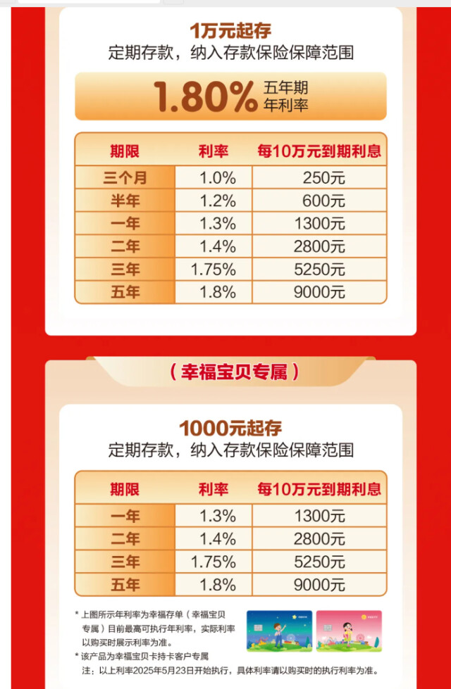 2025年5月,国有大行完成新一轮利率调整,工行、农行、中行、建行、交行活期存款年利率从0.10%下调5个基点至0.05%;定期存款整存整取三个月、半年期、一年期、二年期利率均下调15个基点,调整后的各期限存款利率分别为0.65%、0.85%、0.95%、1.05%。