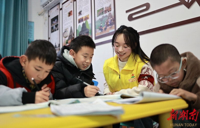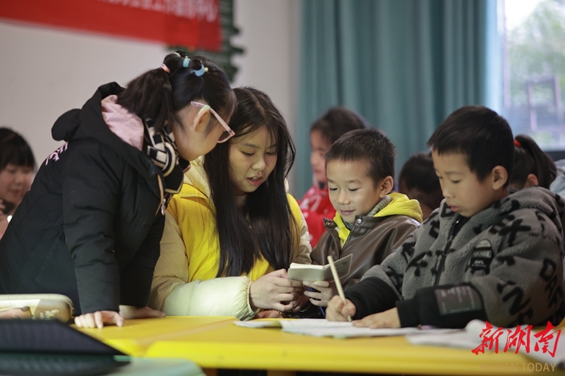 2月6日,通道侗族自治县双江镇城南社区,大学生志愿者为集中托管的孩子辅导学业。寒假期间,该县多家公益组织组建由大学生、社区工作者组成的假期托管志愿者服务队,免费为留守儿童及有需要的青少年提供学习辅导、兴趣培养、心理陪伴等服务,让孩子们在充实、温暖、安全的氛围中度过一个有意义的假期。李尚引 杨美兰 摄影报道(湖南图片库)