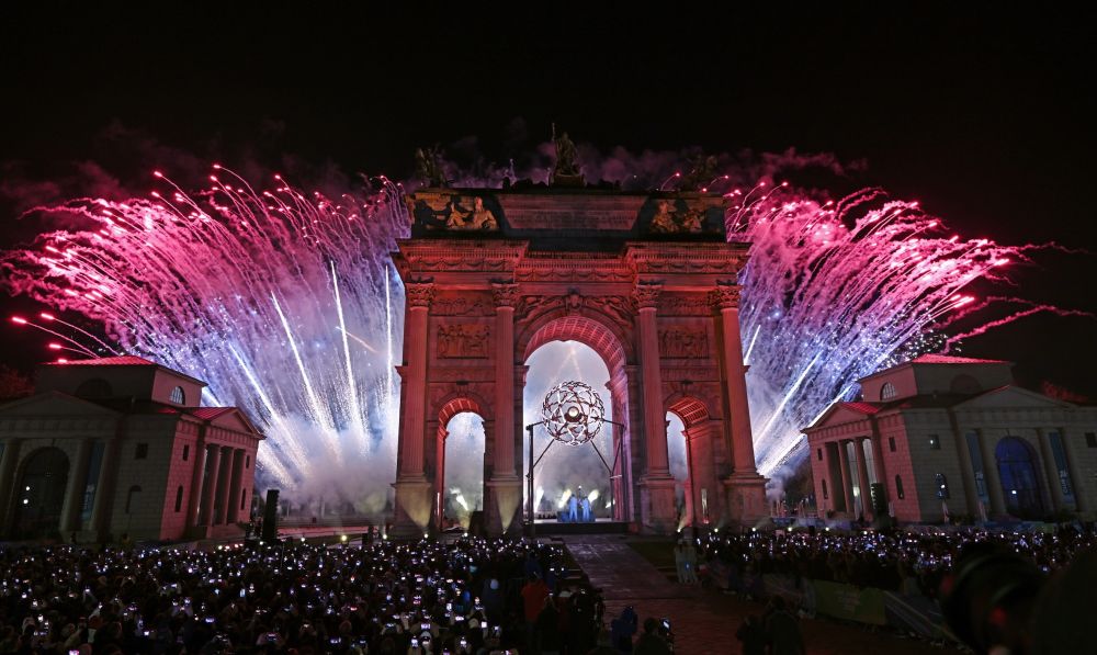 ↑这是在米兰和平拱门拍摄的主火炬被点燃。