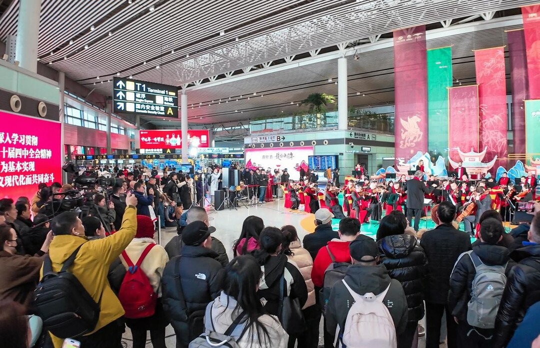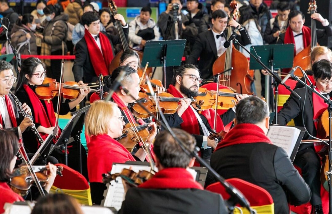此外,桑植民歌《四季花儿开》尽显湖湘民俗特色,《法兰多尔舞曲》《轻骑兵序曲》等世界名曲传递多元国际韵味。返场环节,《太阳出来喜洋洋》《拉德斯基进行曲》让现场氛围持续升温,最终在《我爱你中国》的深情演绎中,现场众多旅客跟唱,掌声与乐声交织,成为春运中一道亮丽的风景线。