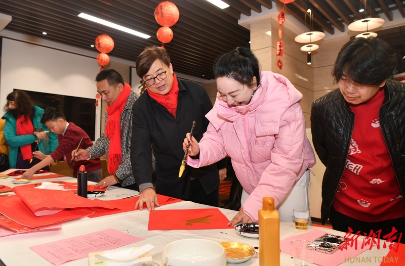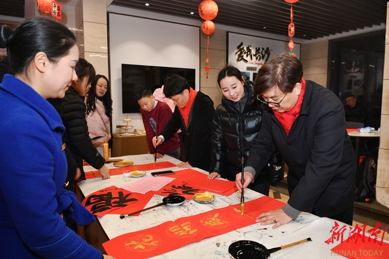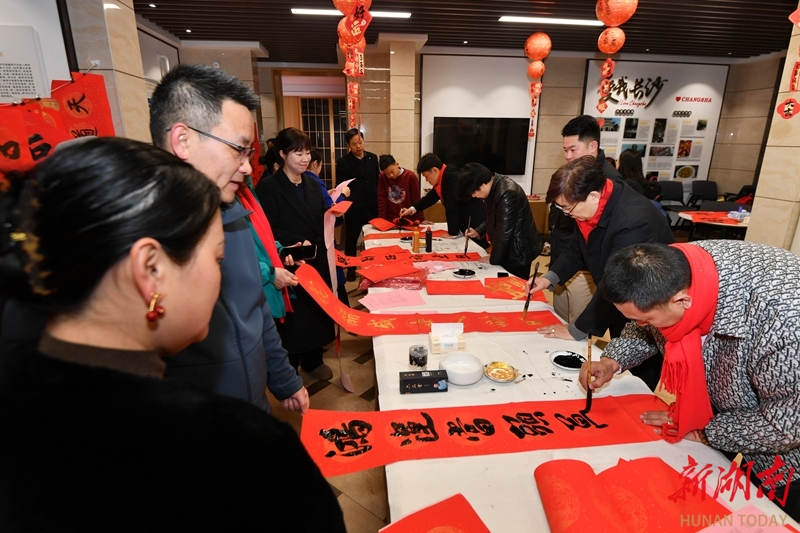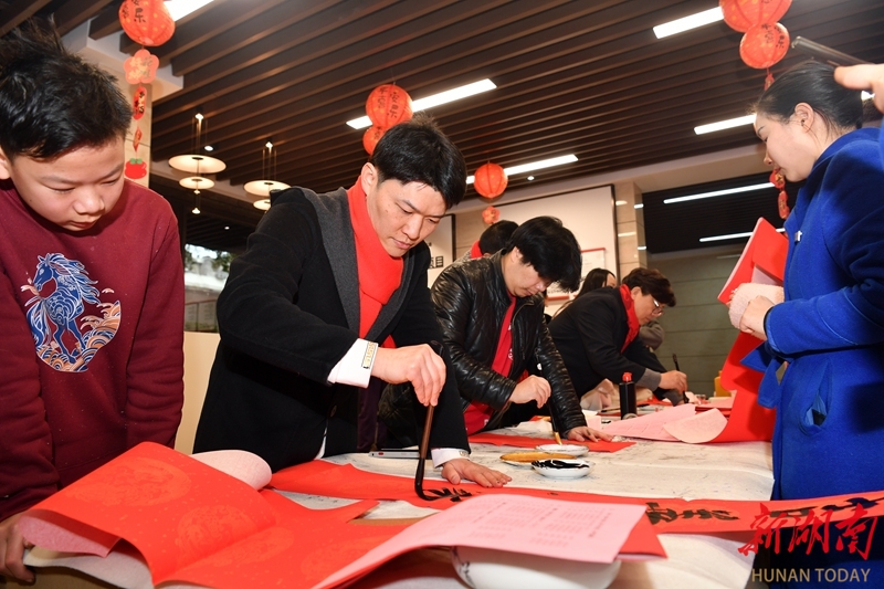 2月7日,长沙运达中央广场,书法家们在为市民写春联、“福”字。当天,长沙市美术家协会、湖南古峰堂文化传播有限公司联合湖南水清木华物业管理有限公司开展“迎春送联”文艺志愿进社区活动,书法家们现场挥毫泼墨,以笔墨传递新春祝福。湖南日报全媒体记者 田超 摄